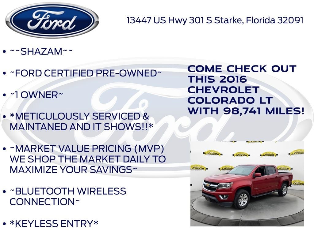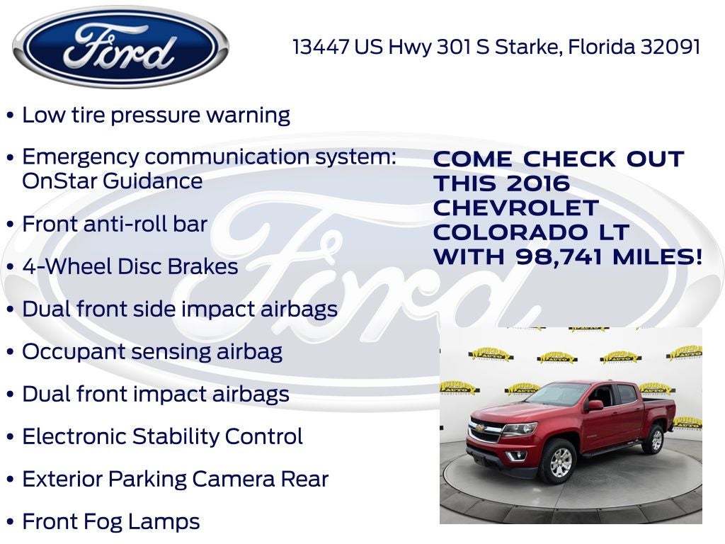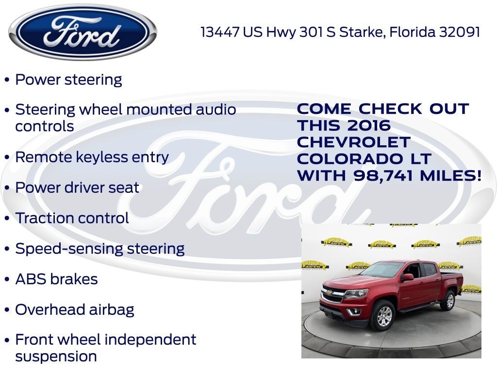 CARFAX One-Owner. Odometer is 14862 miles below market average! Murray Ford Superstore of Starke is proud to offer this good-looking 2016 Chevrolet Colorado in Red Rock Metallic This vehicle is readily available and comes with the following Heavy-Duty Trailering Package, LT Convenience Package (EZ-Lift & Lower Tailgate, Front Fog Lamps, Manual Rear-Sliding Window, Rear-Window Electric Defogger, and Remote Vehicle Starter System), Preferred Equipment Group 2LT, 4-Wheel Disc Brakes, 6 Speakers, 6-Speaker Audio System Feature, ABS brakes, Air Conditioning, Alloy wheels, AM/FM radio: SiriusXM, Apple CarPlay, Automatic Locking Rear Differential, Bumpers: body-color, Cloth Seat Trim, Compass, Delay-off headlights, Driver 4-Way Power Seat Adjuster, Driver door bin, Driver vanity mirror, Dual front impact airbags, Dual front side impact airbags, Electronic Stability Control, Emergency communication system: OnStar Guidance, Exterior Parking Camera Rear, Front anti-roll bar, Front Bucket Seats, Front Center Armrest, Front License Plate Kit, Front reading lights, Front wheel independent suspension, Fully automatic headlights, Illuminated entry, Low tire pressure warning, Occupant sensing airbag, Outside temperature display, Overhead airbag, Overhead console, Panic alarm, Passenger door bin, Passenger vanity mirror, Power door mirrors, Power driver seat, Power steering, Power windows, Premium audio system: Chevrolet MyLink, Radio data system, Radio: AM/FM/SiriusXM w/Chevrolet MyLink, Rear reading lights, Rear seat center armrest, Rear step bumper, Remote keyless entry, Security system, SiriusXM Satellite Radio, Speed control, Speed-sensing steering, Steering wheel mounted audio controls, Tachometer, Telescoping steering wheel, Tilt steering wheel, Tow/Haul Mode, Traction control, Trip computer, Variably intermittent wipers, and Wheels: 17 x 8 Blade Silver Metallic Cast Alloy;