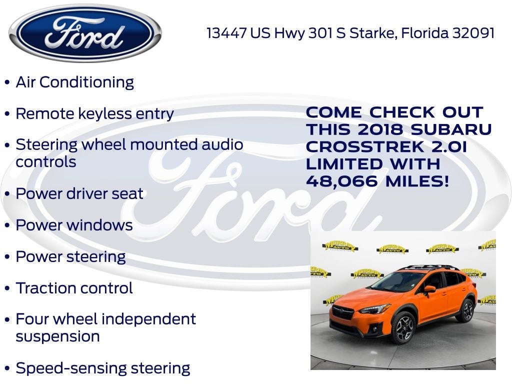 CARFAX One-Owner. Priced below KBB Fair Purchase Price! Odometer is 36668 miles below market average! Murray Ford Superstore of Starke is pumped up to offer this outstanding 2018 Subaru Crosstrek in Sunshine Orange This vehicle is readily available and comes with the following 3.90 Axle Ratio, 4-Wheel Disc Brakes, 6 Speakers, ABS brakes, Air Conditioning, Alloy wheels, AM/FM radio: SiriusXM, Apple CarPlay/Android Auto, Automatic temperature control, Brake assist, Bumpers: body-color, CD player, Driver door bin, Driver vanity mirror, Dual front impact airbags, Dual front side impact airbags, Electronic Stability Control, Emergency communication system: STARLINK, Exterior Parking Camera Rear, Four wheel independent suspension, Front anti-roll bar, Front Bucket Seats, Front Center Armrest, Front fog lights, Front reading lights, Fully automatic headlights, Heated door mirrors, Heated Front Bucket Seats, Heated front seats, Illuminated entry, Knee airbag, Leather Shift Knob, Leather-Trimmed Upholstery, Low tire pressure warning, Occupant sensing airbag, Outside temperature display, Overhead airbag, Overhead console, Panic alarm, Passenger door bin, Passenger vanity mirror, Power door mirrors, Power driver seat, Power steering, Power windows, Radio data system, Radio: Subaru Starlink 8.0 Multimedia Plus System, Rear anti-roll bar, Rear seat center armrest, Rear window defroster, Rear window wiper, Remote keyless entry, Roof rack: rails only, Security system, Speed control, Speed-sensing steering, Split folding rear seat, Spoiler, Steering wheel mounted audio controls, Subaru Starlink Smartphone Integration, Tachometer, Telescoping steering wheel, Tilt steering wheel, Traction control, Trip computer, Turn signal indicator mirrors, Variably intermittent wipers, and Wheels: 18 x 7.0J Aluminum Alloy;