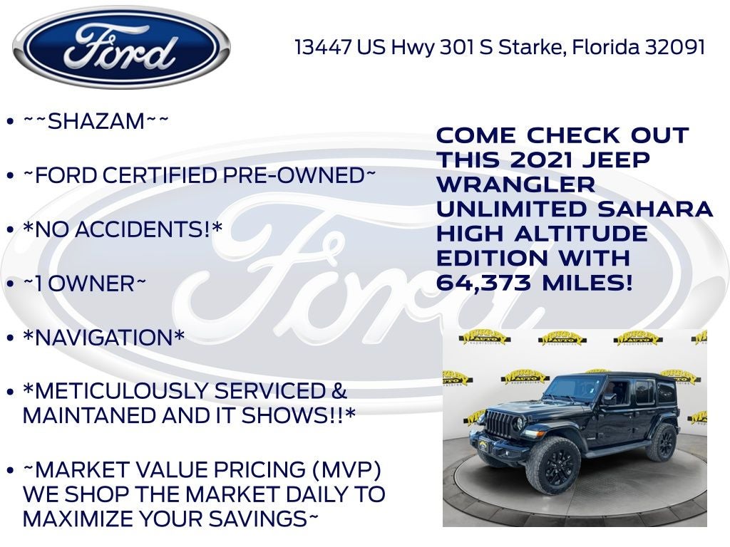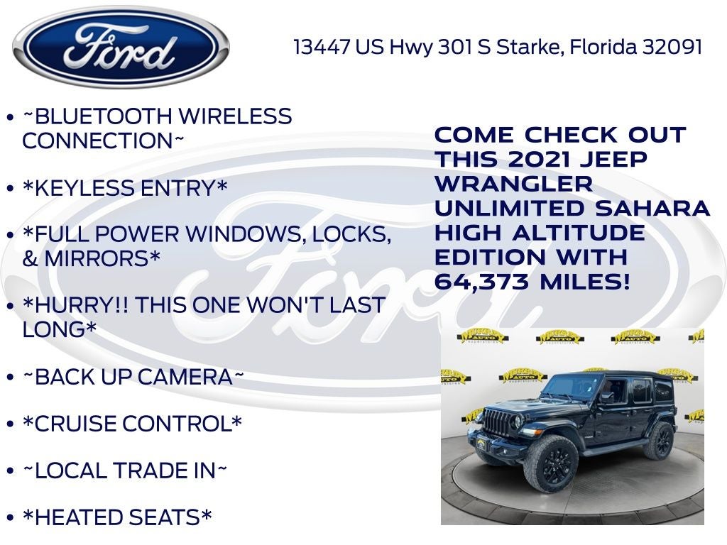 CARFAX One-Owner. Murray Ford Superstore of Starke is pleased to offer this good-looking and fun 2021 Jeep Wrangler in Black Clearcoat This vehicle is readily available and comes with the following 8.4 Radio & Premium Audio Group (1-Year SiriusXM Guardian Trial, 4G LTE Wi-Fi Hot Spot, 5-Year SiriusXM Traffic Service, 5-Year SiriusXM Travel Link Service, 8.4 Touchscreen Display, Alpine Premium Audio System, Auto-Dimming Rear-View Mirror, Emergency/Assistance Call, For Details, Visit DriveUconnect.com, GPS Navigation, HD Radio, Radio: Uconnect 4C Nav w/8.4 Display, SiriusXM Traffic Plus, and SiriusXM Travel Link), Cold Weather Group (Heated Front Seats and Heated Steering Wheel), High Altitude Package, LED Lighting Group (Daytime Running Lamps LED Accents, Front LED Fog Lamps, LED Premium Reflector Headlamps, and LED Taillamps), Quick Order Package 22N High Altitude (3.73 Rear Axle Ratio, Anti-Lock 4-Wheel FNC Disc Brakes, Apple CarPlay, Body Color 3-Piece Hard Top, Body Color Door Handles, Body Color Exterior Mirrors, Body Color Front Bumper, Body Color Fuel Filler Door, Body Color Grille w/Gloss Black Rings, Body Color Rear Bumper w/Step Pads, Caramel Interior Accents, Dana M210 Wide HD Tube Front Axle, Dana M220 Wide Rear Axle, For More Info, Call 800-643-2112, Full Body Color Fender Flares, Google Android Auto, GPS Antenna Input, Integrated Voice Command w/Bluetooth®, Leather Trimmed Bucket Seats (KL), Leather Wrapped Park Brake Handle, Leather Wrapped Shift Knob, Off-Road Info Pages, Premium Dark Exterior Accents, Remote Proximity Keyless Entry, Sport Suspension, Summit Badging, USB Host Flip, Wheels: 20 x 8 Fully Painted Aluminum, and Wrapped I/P Bezel w/Caramel Stitch), Safety Group (Blind Spot & Cross Path Detection and ParkSense Rear Park Assist System), Trailer Tow & HD Electrical Group (240 Amp Alternator, 7 & 4 Pin Wiring Harness, 700 Amp Maintenance Free Battery, Auxiliary Switches, and Class II Receiver Hitch), Ford Blue Advantage: Blue Certified Certified, 4-Wheel Disc Brakes, 8 Speakers, ABS brakes, Air Conditioning, Alloy wheels, AM/FM radio: SiriusXM, Anti-Spin Differential Rear Axle, Apple CarPlay/Android Auto, Automatic temperature control, Aux Battery, Brake assist, Cloth Low-Back Bucket Seats, Compass, Delay-off headlights, Driver door bin, Driver vanity mirror, Dual front impact airbags, Dual front side impact airbags, Electronic Stability Control, Front anti-roll bar, Front Bucket Seats, Front Center Armrest w/Storage, Front dual zone A/C, Front fog lights, Front License Plate Bracket, Front reading lights, Fully automatic headlights, Garage door transmitter, Heated door mirrors, Heavy Duty Suspension w/Gas Shocks, Illuminated entry, Integrated roll-over protection, Leather steering wheel, Low tire pressure warning, MOPAR All-Weather Floor Mats (DISC), Non-Lock Fuel Cap w/o Discriminator, Occupant sensing airbag, Outside temperature display, Panic alarm, ParkView Rear Back-Up Camera, Passenger door bin, Passenger vanity mirror, Power door mirrors, Power steering, Power windows, Radio data system, Radio: Uconnect 4 w/7 Display, Rear anti-roll bar, Rear reading lights, Remote keyless entry, Remote Start System, Security system, Speed control, Split folding rear seat, Steering wheel mounted audio controls, Stop-Start Dual Battery System, Tachometer, Telescoping steering wheel, Tilt steering wheel, Traction control, Trip computer, Variably intermittent wipers, Voltmeter, and Wheels: 18 x 7.5 Polished w/Gray Spokes;