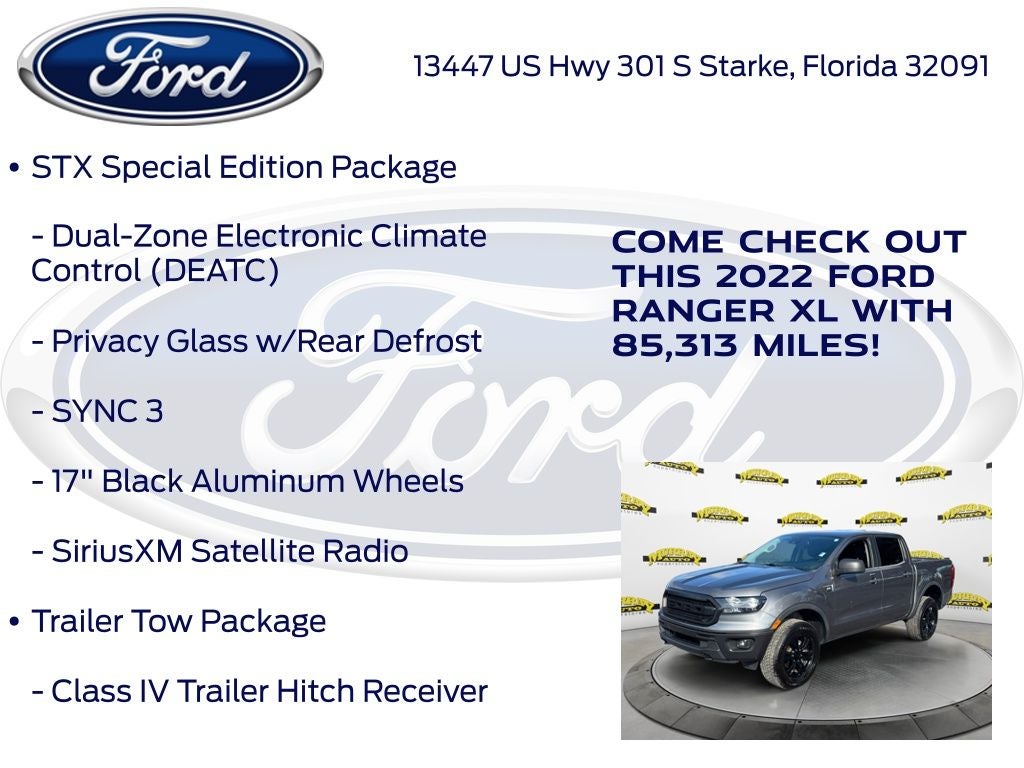 Murray Ford Superstore of Starke is very proud to offer this durable, reliable 2022 Ford Ranger in Carbonized Gray Metallic This vehicle is readily available and comes with the following Equipment Group 101A High (6 Speakers, Cruise Control, Day/Night Rear-View Mirror, Perimeter Anti-Theft Alarm, Power Glass Sideview Mirrors, Remote Key Fob w/Tailgate Lock, and SYNC), FX2 Package (Electronic-Locking Rear Differential, Exposed Front Tow Hooks, FX2 Box Decal, Off-Road Screen in Cluster, and Off-Road Tuned Suspension), STX Appearance Package (Fog Lamps, Front Premium Cloth Bucket Seats, STX Box Decal, and Wheels: 17 Silver-Painted Aluminum), STX Special Edition Package (17 Black Aluminum Wheels, Dual-Zone Electronic Climate Control (DEATC), Privacy Glass w/Rear Defrost, SiriusXM Satellite Radio, and SYNC 3), Trailer Tow Package (Class IV Trailer Hitch Receiver), Ford Blue Certified Certified, 110V AC Power Outlet, 4 Speakers, 4-Wheel Disc Brakes, 5 Rectangular Black Running Boards, ABS brakes, Air Conditioning, AM/FM radio, AM/FM Stereo, Auto Start-Stop Technology, Auto-dimming Rear-View mirror, Body-Color SecuriCode Keyless-Entry Keypad, Brake assist, Carpet Flooring w/Floor Mats, Compass, Delay-off headlights, Driver door bin, Dual front impact airbags, Dual front side impact airbags, Electronic Stability Control, Exterior Parking Camera Rear, Front anti-roll bar, Front Bucket Seats, Front Center Armrest, Front Cloth Bucket Seats, Front wheel independent suspension, Fully automatic headlights, Gray Pixelated Graphics, Illuminated entry, Low tire pressure warning, Occupant sensing airbag, Overhead airbag, Passenger door bin, Pickup Box Extender, Power steering, Power windows, Rear seat center armrest, Rear step bumper, Speed-sensing steering, Steering wheel mounted audio controls, Telescoping steering wheel, Tilt steering wheel, Traction control, Trip computer, Variably intermittent wipers, Voltmeter, and Wheels: 16 Silver Steel;
