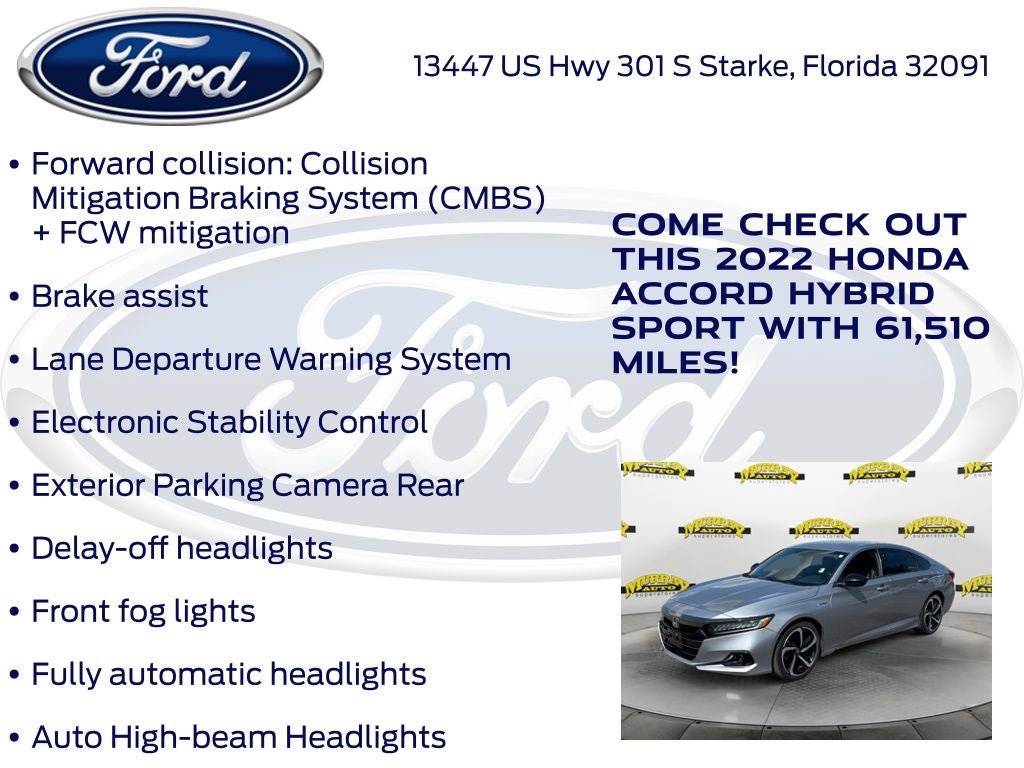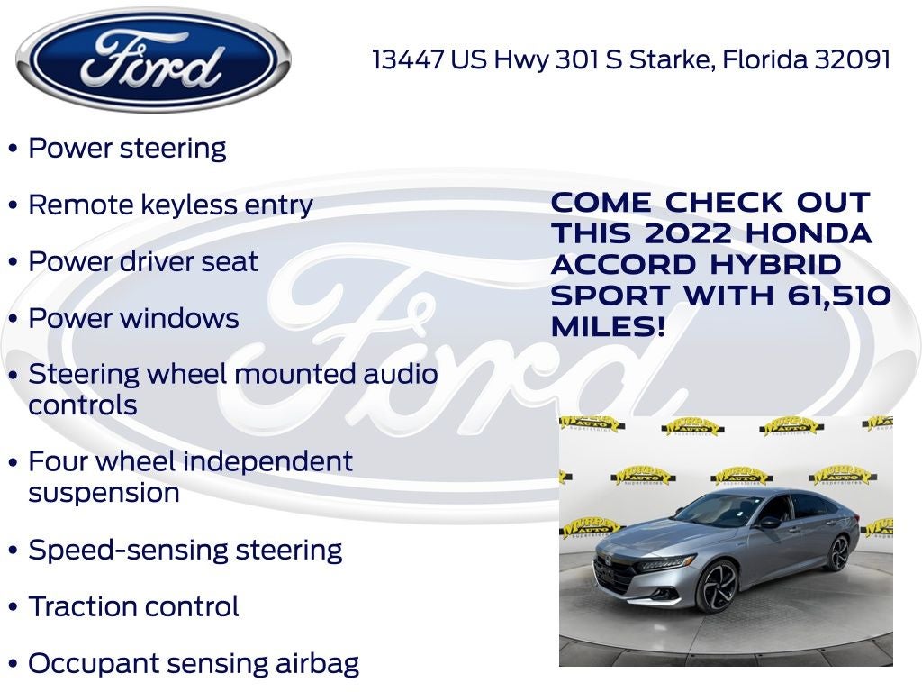 Murray Ford Superstore of Starke is pleased to offer this outstanding-looking 2022 Honda Accord Hybrid in Lunar Silver Metallic This vehicle is readily available and comes with the following Ford Blue Advantage: Blue Certified Certified, 2.0L 4-Cylinder DOHC 16V i-VTEC, 4-Wheel Disc Brakes, 8 Speakers, ABS brakes, Adaptive Cruise Control: Adaptive Cruise Control (ACC) with Low-Speed Follow, Air Conditioning, Alloy wheels, AM/FM radio: SiriusXM, Apple CarPlay/Android Auto, Auto High-beam Headlights, Automatic temperature control, Brake assist, Bumpers: body-color, Delay-off headlights, Driver door bin, Driver vanity mirror, Dual front impact airbags, Dual front side impact airbags, Electronic Stability Control, Emergency communication system: HondaLink, Exterior Parking Camera Rear, Fabric w/Synthetic Leather Seat Trim, Forward collision: Collision Mitigation Braking System (CMBS) + FCW mitigation, Four wheel independent suspension, Front anti-roll bar, Front Bucket Seats, Front Center Armrest, Front dual zone A/C, Front fog lights, Front reading lights, Fully automatic headlights, Heated door mirrors, Illuminated entry, Knee airbag, Lane Departure Warning System, Leather steering wheel, Low tire pressure warning, Occupant sensing airbag, Outside temperature display, Overhead airbag, Overhead console, Panic alarm, Passenger door bin, Passenger vanity mirror, Power door mirrors, Power driver seat, Power steering, Power windows, Radio data system, Radio: 180-Watt HD Audio System, Rear anti-roll bar, Rear seat center armrest, Rear window defroster, Remote keyless entry, Security system, Speed control, Speed-sensing steering, Speed-Sensitive Wipers, Split folding rear seat, Steering wheel mounted audio controls, Telescoping steering wheel, Tilt steering wheel, Traction control, Trip computer, Variably intermittent wipers, and Wheels: 19 Machine-Finished Alloy w/Black Inserts;