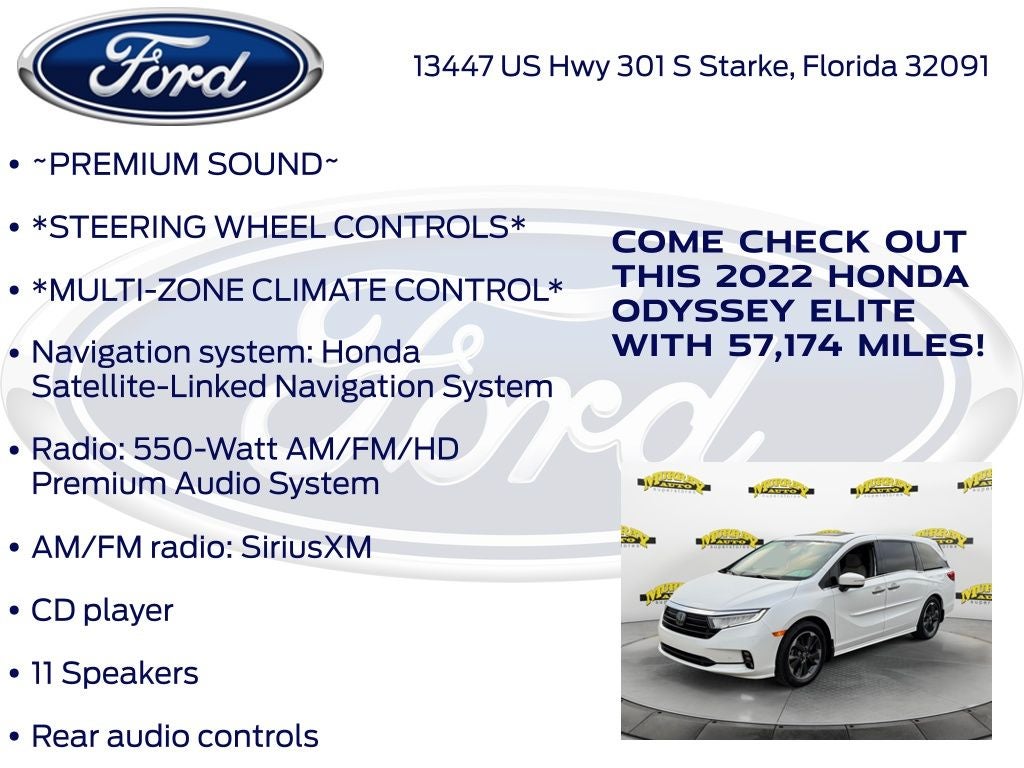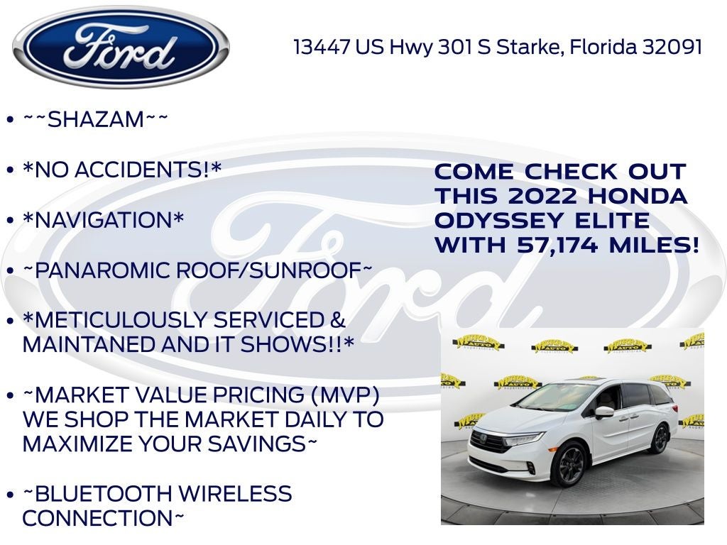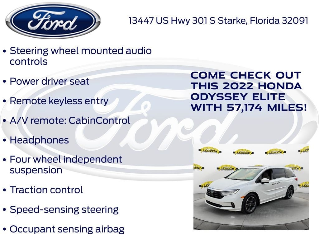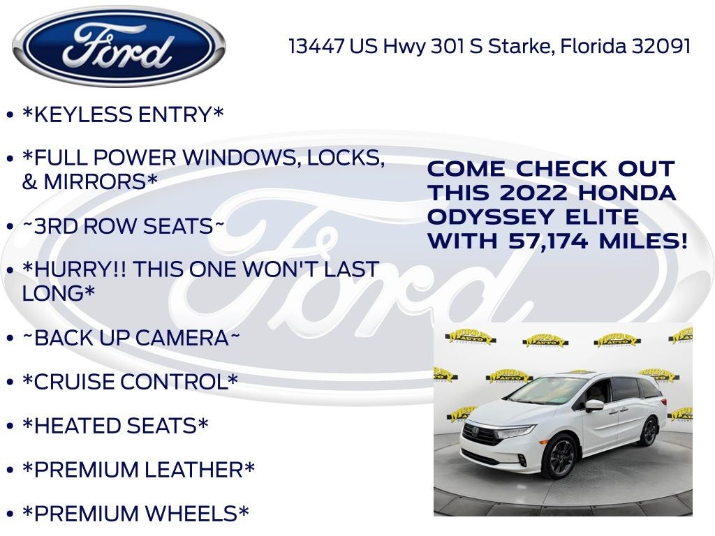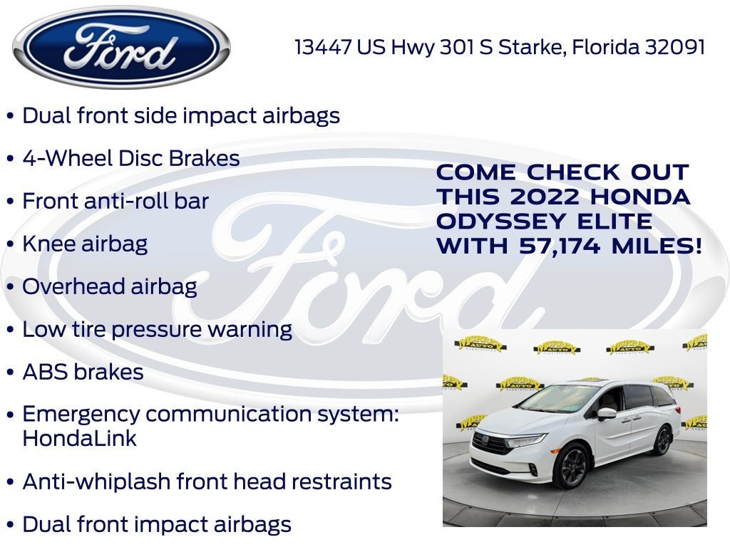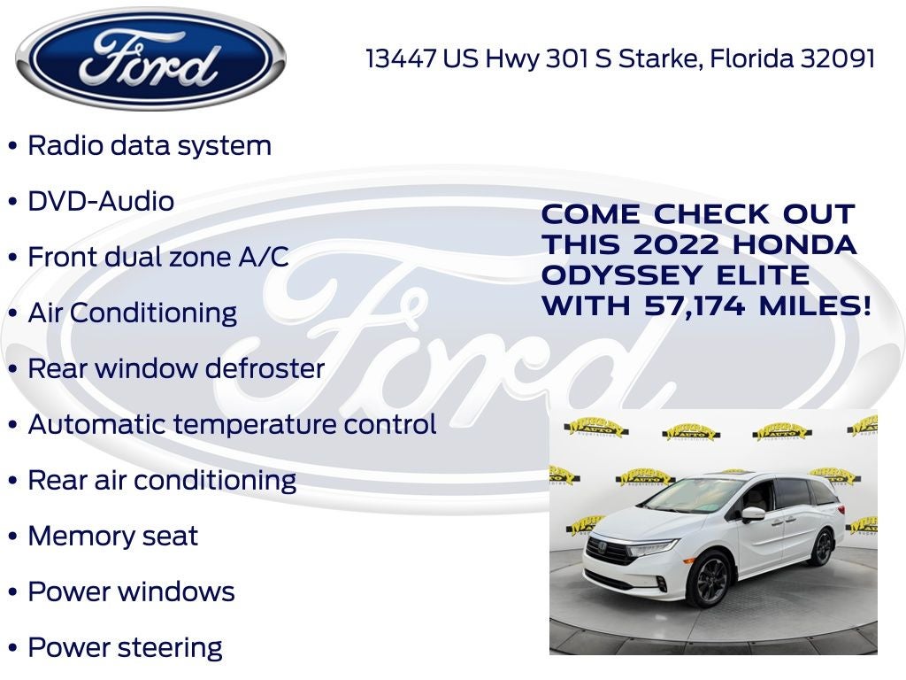 Odometer is 6099 miles below market average! Murray Ford Superstore of Starke is pumped up to offer this great-looking 2022 Honda Odyssey in Platinum White This vehicle is readily available and comes with the following 11 Speakers, 3.61 Axle Ratio, 3rd row seats: split-bench, 4-Wheel Disc Brakes, A/V remote: CabinControl, ABS brakes, Adaptive Cruise Control: Adaptive Cruise Control (ACC) with Low-Speed Follow, Air Conditioning, Alloy wheels, AM/FM radio: SiriusXM, Anti-whiplash front head restraints, Apple CarPlay/Android Auto, Auto High-beam Headlights, Auto-dimming door mirrors, Auto-dimming Rear-View mirror, Automatic temperature control, Blind Spot Information (BSI) System warning, Brake assist, Bumpers: body-color, CD player, Compass, Delay-off headlights, Driver door bin, Driver vanity mirror, Driver's Seat Mounted Armrest, Dual front impact airbags, Dual front side impact airbags, DVD-Audio, Electronic Stability Control, Emergency communication system: HondaLink, Exterior Parking Camera Rear, Forward collision: Collision Mitigation Braking System (CMBS) + FCW mitigation, Four wheel independent suspension, Front anti-roll bar, Front Bucket Seats, Front dual zone A/C, Front fog lights, Front reading lights, Fully automatic headlights, Garage door transmitter: HomeLink, Headphones, Heated & Ventilated Front Bucket Seats, Heated door mirrors, Heated front seats, Heated steering wheel, Illuminated entry, Knee airbag, Lane departure: Lane Keeping Assist System (LKAS) active, Leather Seat Trim, Leather steering wheel, Low tire pressure warning, Memory seat, Navigation system: Honda Satellite-Linked Navigation System, Occupant sensing airbag, Outside temperature display, Overhead airbag, Overhead console, Panic alarm, Passenger door bin, Passenger seat mounted armrest, Passenger vanity mirror, Power door mirrors, Power driver seat, Power Liftgate, Power moonroof, Power passenger seat, Power steering, Power windows, Radio data system, Radio: 550-Watt AM/FM/HD Premium Audio System, Rain sensing wipers, Rear air conditioning, Rear anti-roll bar, Rear audio controls, Rear reading lights, Rear seat center armrest, Rear window defroster, Rear window wiper, Reclining 3rd row seat, Remote keyless entry, Security system, Speed control, Speed-sensing steering, Speed-Sensitive Wipers, Split folding rear seat, Spoiler, Steering wheel mounted audio controls, Tachometer, Telescoping steering wheel, Tilt steering wheel, Traction control, Trip computer, Turn signal indicator mirrors, Variably intermittent wipers, Ventilated front seats, and Wheels: 19 Unique Machine-Finished Alloy;