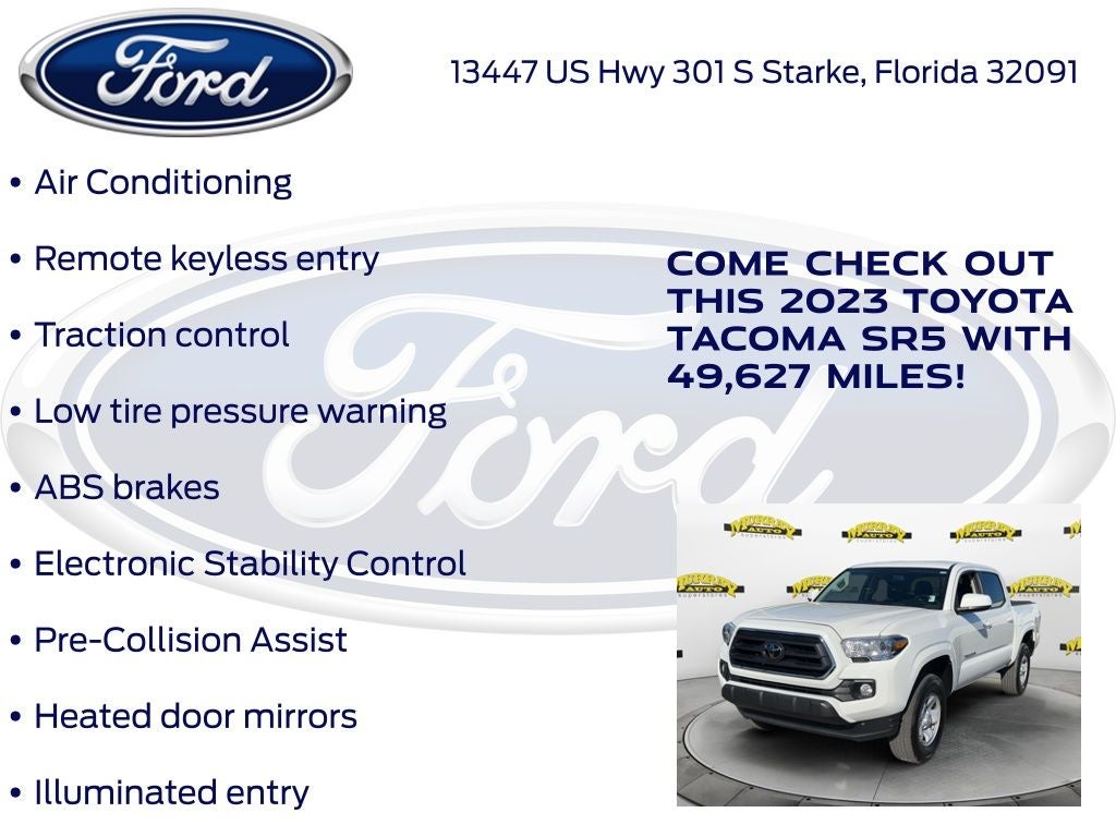 CARFAX One-Owner. Murray Ford Superstore of Starke is pumped up to offer this hardy, reliable 2023 Toyota Tacoma in Ice Cap This vehicle is readily available and comes with the following ABS brakes, Air Conditioning, Electronic Stability Control, Heated door mirrors, Illuminated entry, Low tire pressure warning, Pre-Collision Assist, Remote keyless entry, Traction control, 16 Styled Steel Wheels, 6 Speakers, AM/FM radio: SiriusXM, Anti-whiplash front head restraints, Apple CarPlay/Android Auto, Auto High-beam Headlights, Axle Ratio: 4.30, Black Headlamp Bezel, Brake assist, Bumpers: body-color, Charcoal Grille w/Chrome Surround, Chrome Rear Bumper, Daytime Running Lamps, Driver door bin, Dual front impact airbags, Dual front side impact airbags, Emergency communication system: Safety Connect (1-year trial), Exterior Parking Camera Rear, Fabric Seat Trim, Front anti-roll bar, Front Bucket Seats, Front Center Armrest, Front Door Smart Key System w/Push Button Start, Front Fog & Driving Lamp, Front fog lights, Front reading lights, Front Seats, Front wheel independent suspension, Knee airbag, Occupant sensing airbag, Outside temperature display, Overhead airbag, Overhead console, Panic alarm, Passenger door bin, Power door mirrors, Power steering, Power windows, Radio: Audio, Rear step bumper, Speed control, Speed-sensing steering, Split folding rear seat, Steering wheel mounted audio controls, Tachometer, Telescoping steering wheel, Tilt steering wheel, Trip computer, and Variably intermittent wipers;