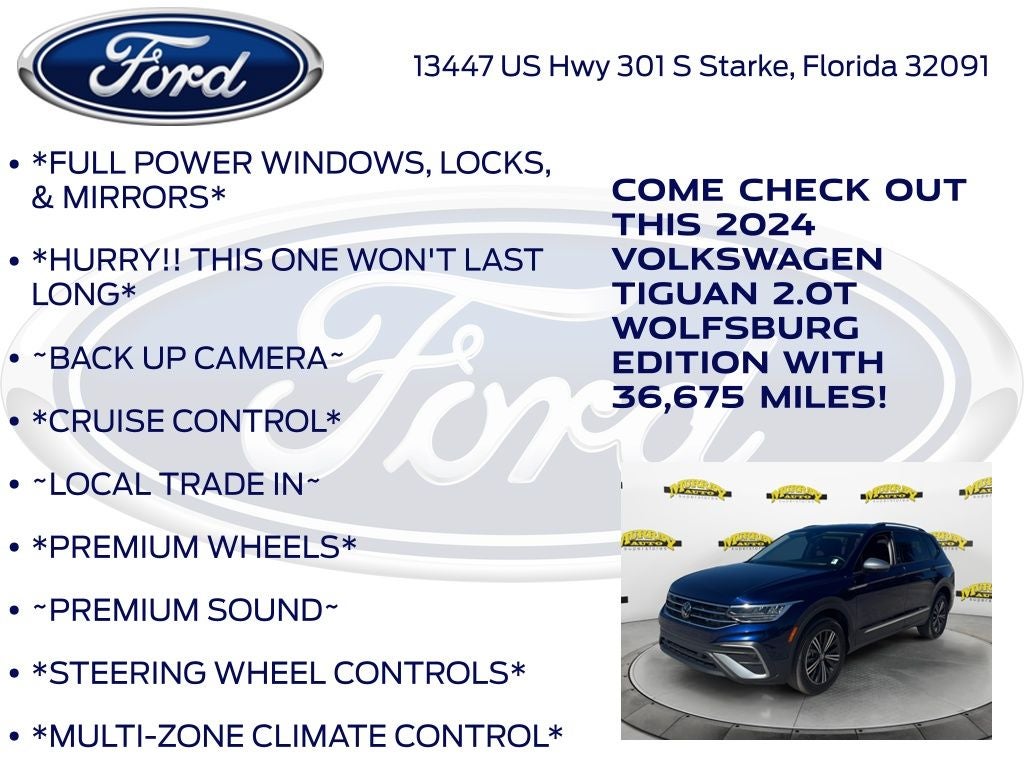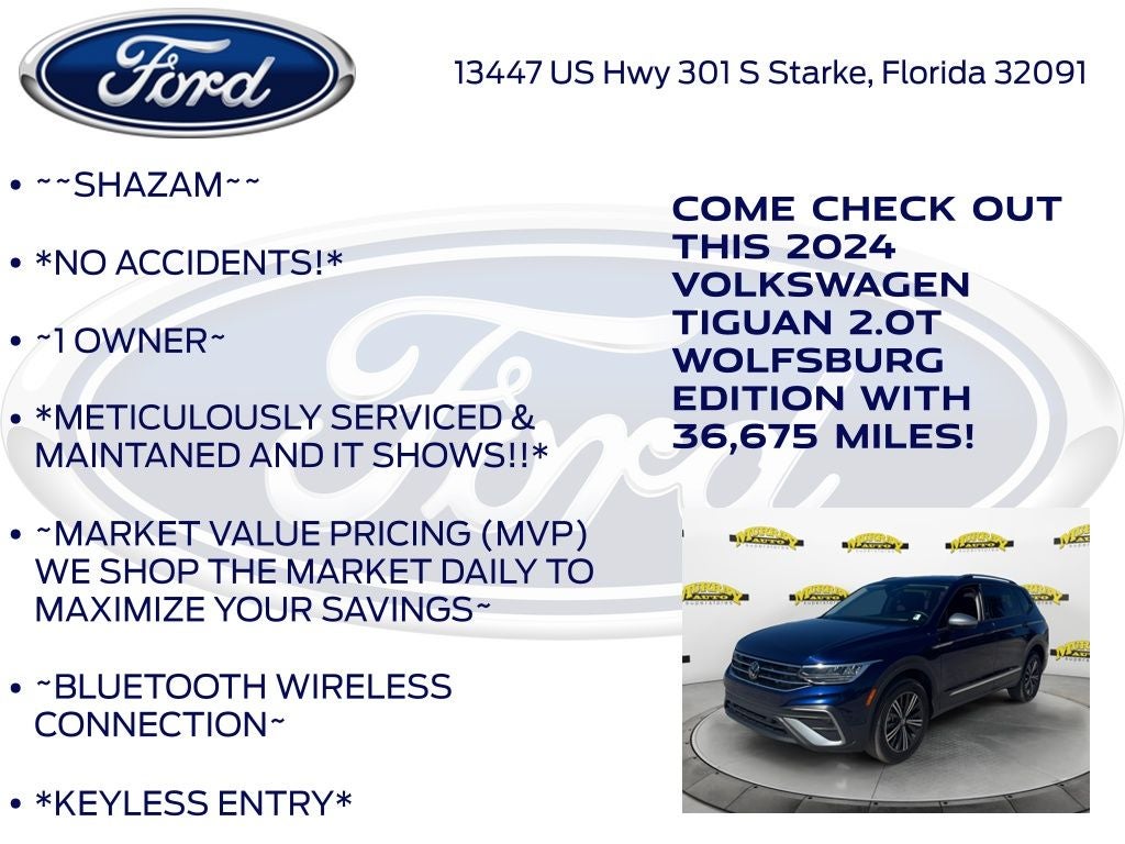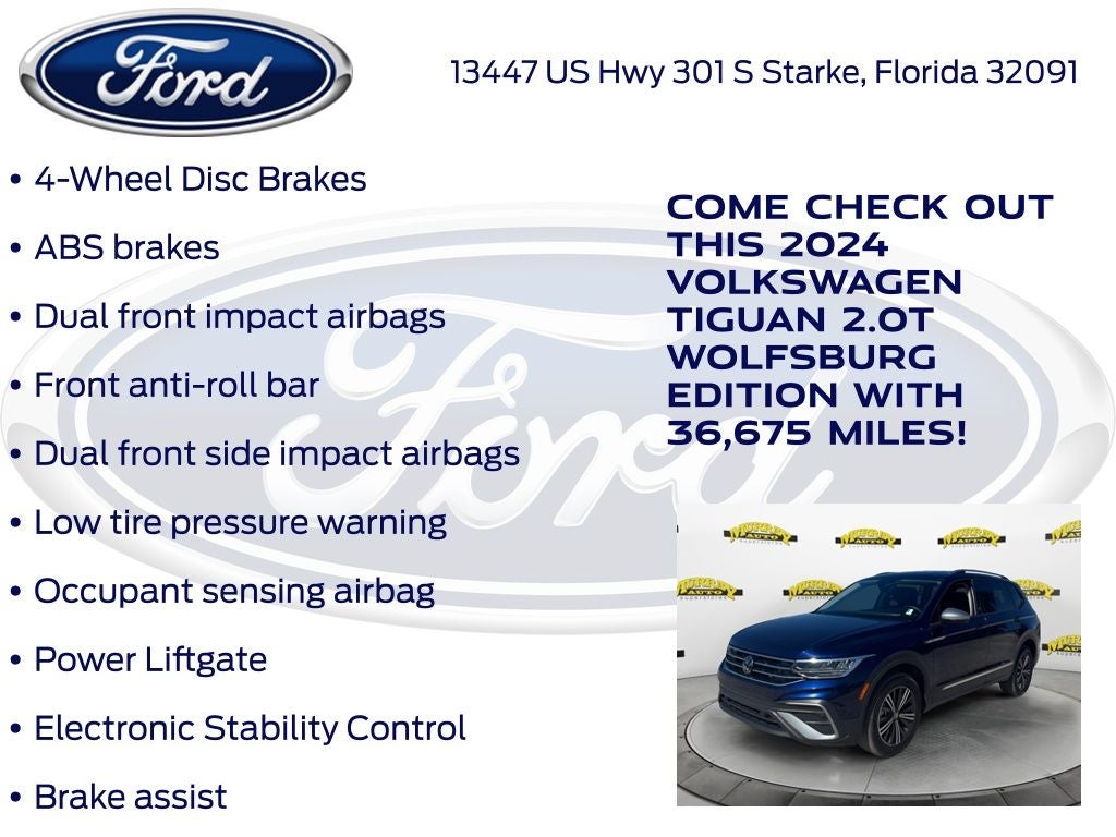CARFAX One-Owner. Murray Ford Superstore of Starke is very proud to offer this fantastic 2024 Volkswagen Tiguan in Atlantic Blue Metallic This vehicle is readily available and comes with the following 3.33 Axle Ratio, 3rd row seats: bench, 4-Wheel Disc Brakes, 4-Wheel Independent Suspension, 6 Speakers, ABS brakes, Air Conditioning, Alloy wheels, AM/FM radio: SiriusXM with 360L, Auto-dimming Rear-View mirror, Brake assist, Bumpers: body-color, Compass, Delay-off headlights, Driver door bin, Driver vanity mirror, Dual front impact airbags, Dual front side impact airbags, Electronic Stability Control, Emergency communication system: VW Car-Net Safe & Secure 5-year, Exterior Parking Camera Rear, Four wheel independent suspension, Front anti-roll bar, Front Bucket Seats, Front Center Armrest, Front reading lights, Fully automatic headlights, Heated door mirrors, Heated Front Seats, Heated front seats, Illuminated entry, Leather Shift Knob, Low tire pressure warning, Occupant sensing airbag, Outside temperature display, Overhead airbag, Overhead console, Panic alarm, Passenger door bin, Passenger vanity mirror, Power door mirrors, Power driver seat, Power Liftgate, Power steering, Power windows, Radio data system, Radio: MIB3 Composition Media AM/FM/HD, Rain sensing wipers, Rear anti-roll bar, Rear reading lights, Rear seat center armrest, Rear window defroster, Rear window wiper, Remote keyless entry, Security system, Speed control, Speed-sensing steering, Split folding rear seat, Spoiler, Steering wheel mounted audio controls, Tachometer, Telescoping steering wheel, Tilt steering wheel, Traction control, Trip computer, Turn signal indicator mirrors, and Variably intermittent wipers;